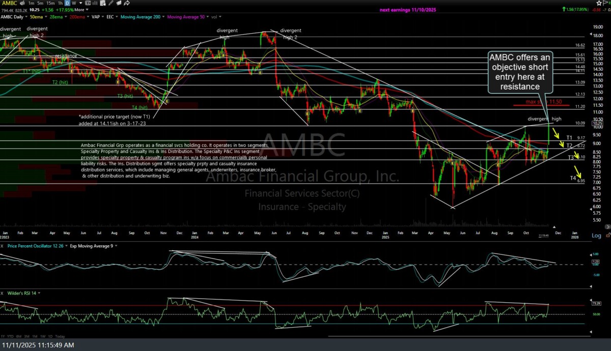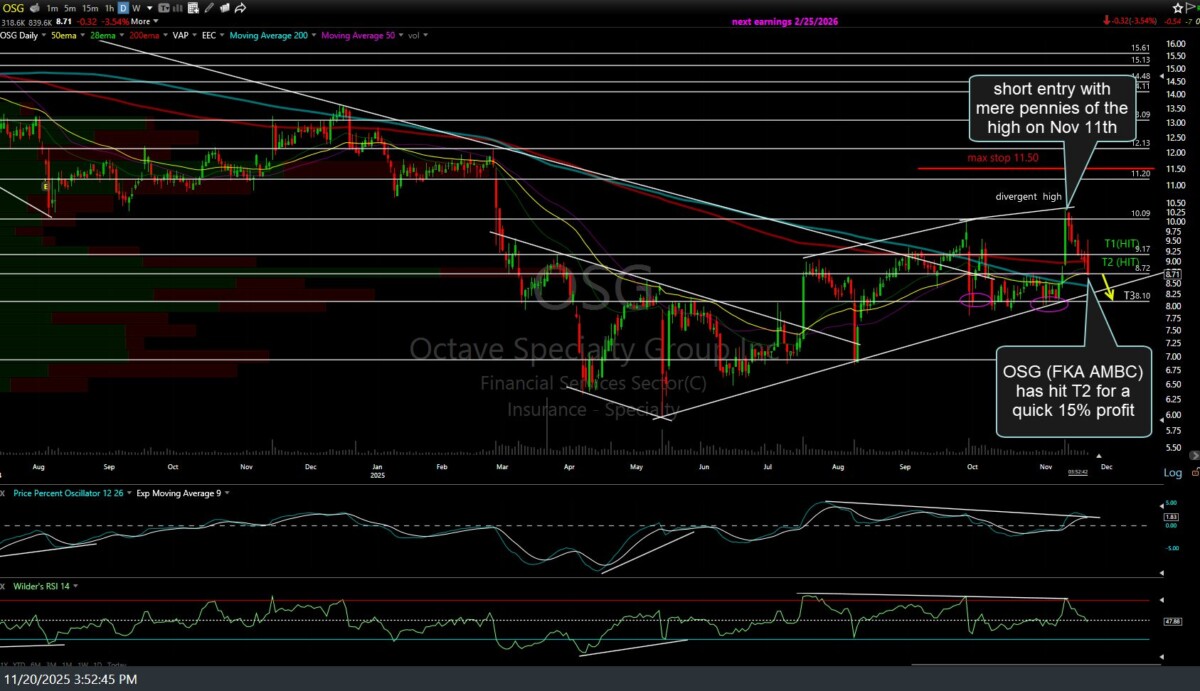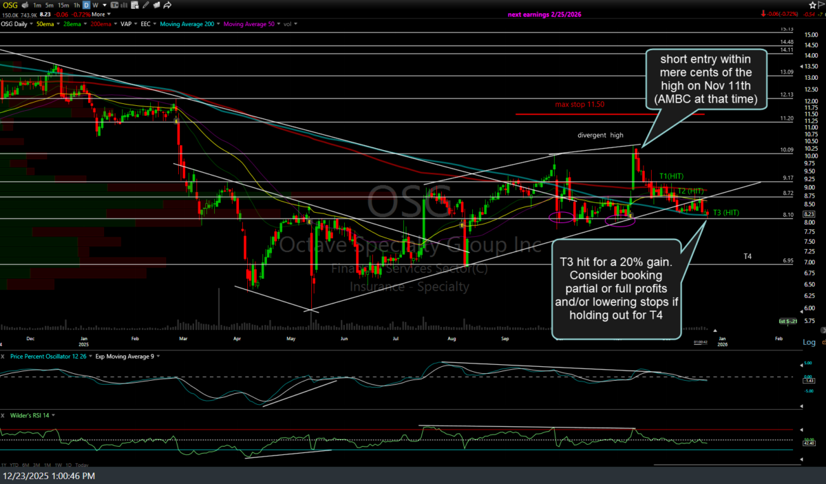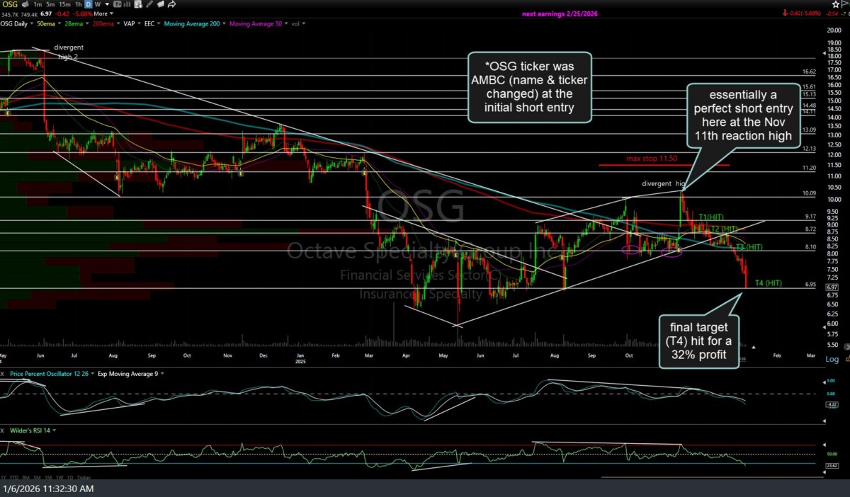 The OSG (Octave Specialty Group Inc.) swing trade has just hit the final price target (T4) for a 32% profit from the essentially perfect short entry at the Nov 11th reaction high for a 32% profit. As this was and still is the final price target, consider booking full profits as the R/R to remain short is no longer favorable IMO. Previous* & updated daily charts below.