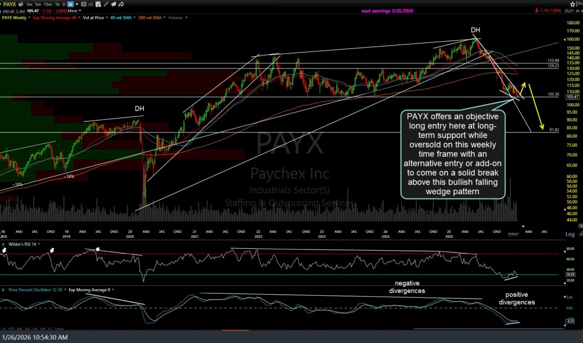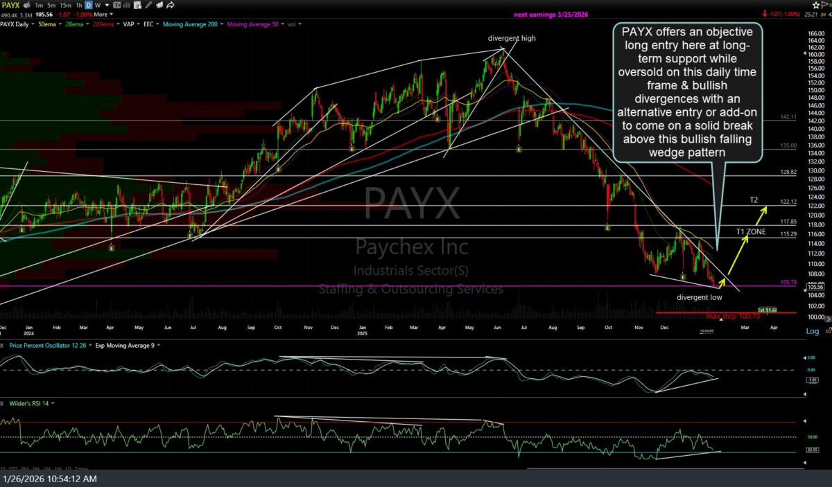 PAYX (Paychex Inc.) offers an objective long entry here at long-term support, while oversold on this daily time frame & bullish divergences with an alternative entry or add-on to come on a solid break above this bullish falling wedge pattern. The maximum suggested stop (if targeting T2) is a drop or daily close below 100.70. Daily & weekly charts below.