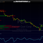 fyi- i moved my stop up to just below this line, which is actually a few cents below entry. however, that looks like an objective technical level that PCX need to holds on any pullback or risk another wave of selling. an upside break of this triangle would likely cause the stock to make another thrust higher. remember, this stock has been in complete free fall mode and could be trying to pound out a bottom here. therefore, each spike up on volume is often met with a follow-up wave of remorseful longs using that pop as an opportunity to end the pain and sell their position. as always, the million dollar question is; are there more trapped longs waiting to sell on an bounce or have the sellers exhausted yet? unfortunately, volume patterns on the daily chart show no indication of a selling climax. however, the recent surge in volume on the intraday charts could signal the early stages of at least a near-term selling climax. 5 min chart shown.