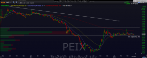 this one is for the gunslingers (nimble/aggressive traders) only. if PEIX breaks below the key 1.00 level once more (looks like the boyz took it under recently just to roast some shorts) then the next stop will most likely be bankruptcy court, or at the very least a de-listing from the nasdaq and new home (and penny stock price) on the pink-shits or bulletin board. best advice is to set a price alert for a move under 1.00 and forget about it for now since there’s no telling when or if it will break below (although i think it’s more a matter of when than if). of course, if you short the breakdown, just make sure to keep your position size commensurate with the huge potential volatility that comes with such a low priced stock. the typical 5% or so trailing stop just doesn’t work on these guys… all they do is virtually guarantee you a quick loss. as always, DYODD.