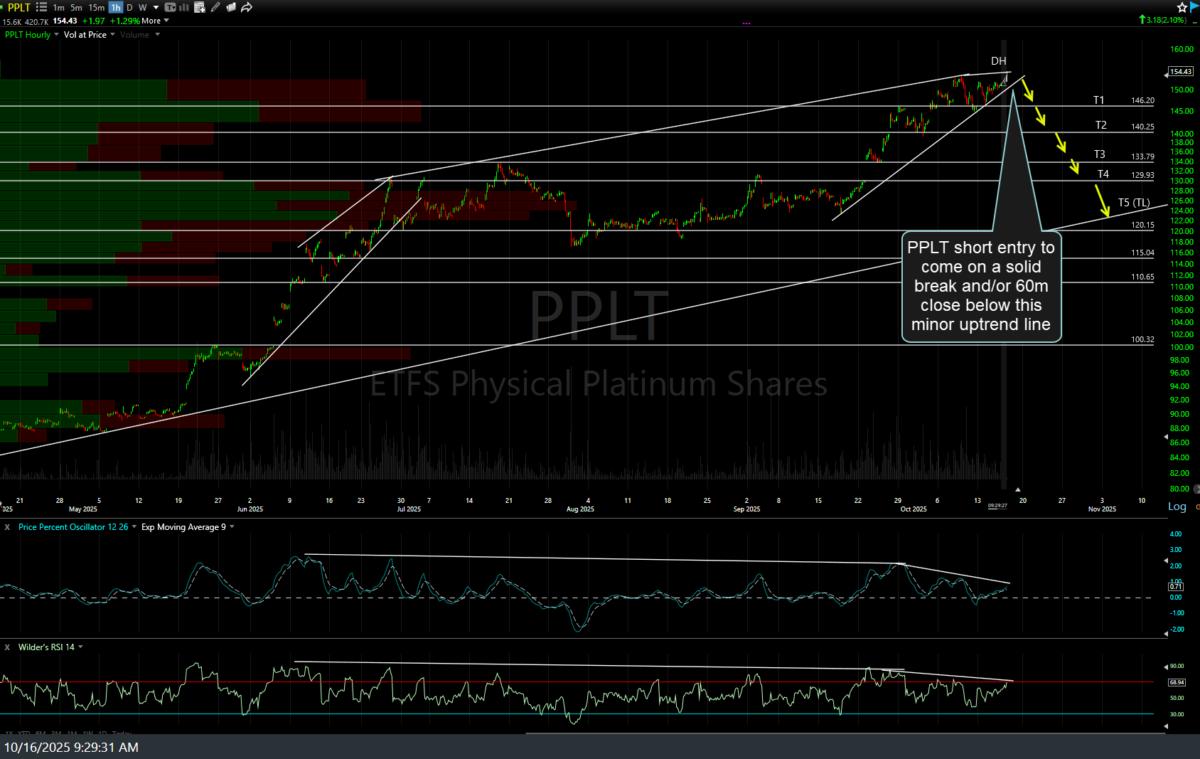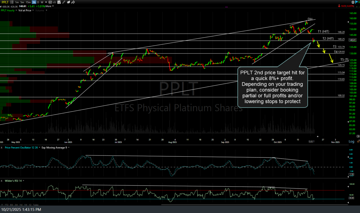The /PL (platinum futures) or PPLT (platinum ETF) short swing trade has hit the second price target for a quick 8%+ profit. Depending on your trading plan, consider booking partial or full profits and/or lowering stops to protect gains. Previous (Thursday’s) & updated 60-minute charts of PPLT below.