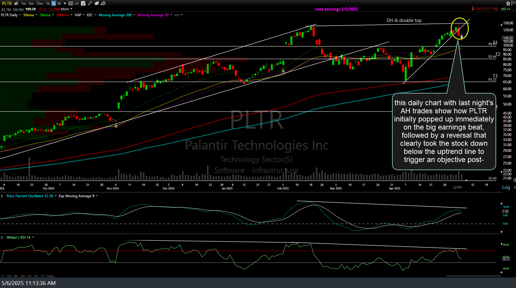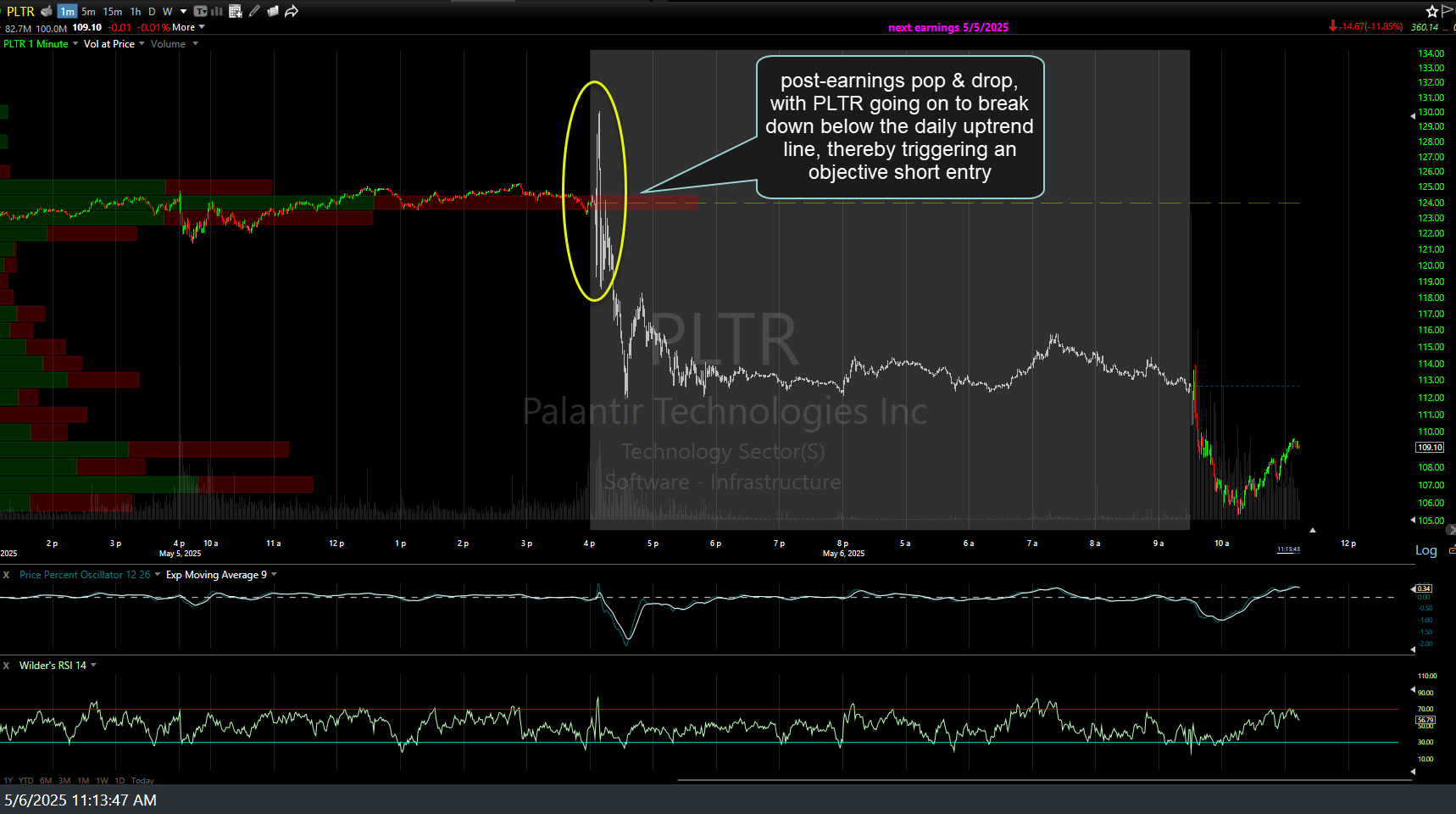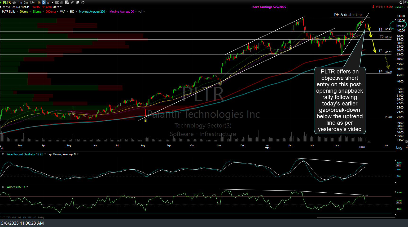 PLTR (Palantir Technologies Inc.) offers an objective short entry on this post-opening snapback rally following today’s earlier gap/break-down below the uptrend line as per yesterday’s video. Stops should be commensurate with one’s preferred price target(s), relative to their specific entry price(s) using a favorable R/R of 2:1 or better. Daily chart below.