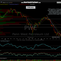 PWE has hit the first target today for a 12.7% gain from entry. this chart looks very constructive and i favor at least T2 on this trade. however, consider raising stops or taking some profits, depending on your own trading plan. the original weekly targets remain the official targets although i have added some resistance level/potential targets to the updated daily chart below. weekly & daily charts in order as posted: