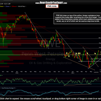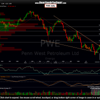 After climbing 22% from since breaking out above the daily rising wedge pattern exactly one month ago today, the PWE long trade was up as much as 22% on Tuesday, coming within 20 cents of it’s first target before getting dragged down, kicking & screaming, with the broad market. Although this remains one of my favorite (and very few) long trades, PWE, like most longs, even those with bullish chart patterns, will likely get taken down with the herd.