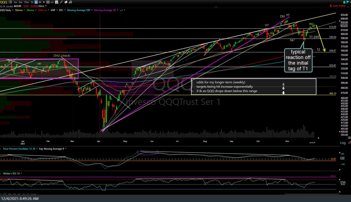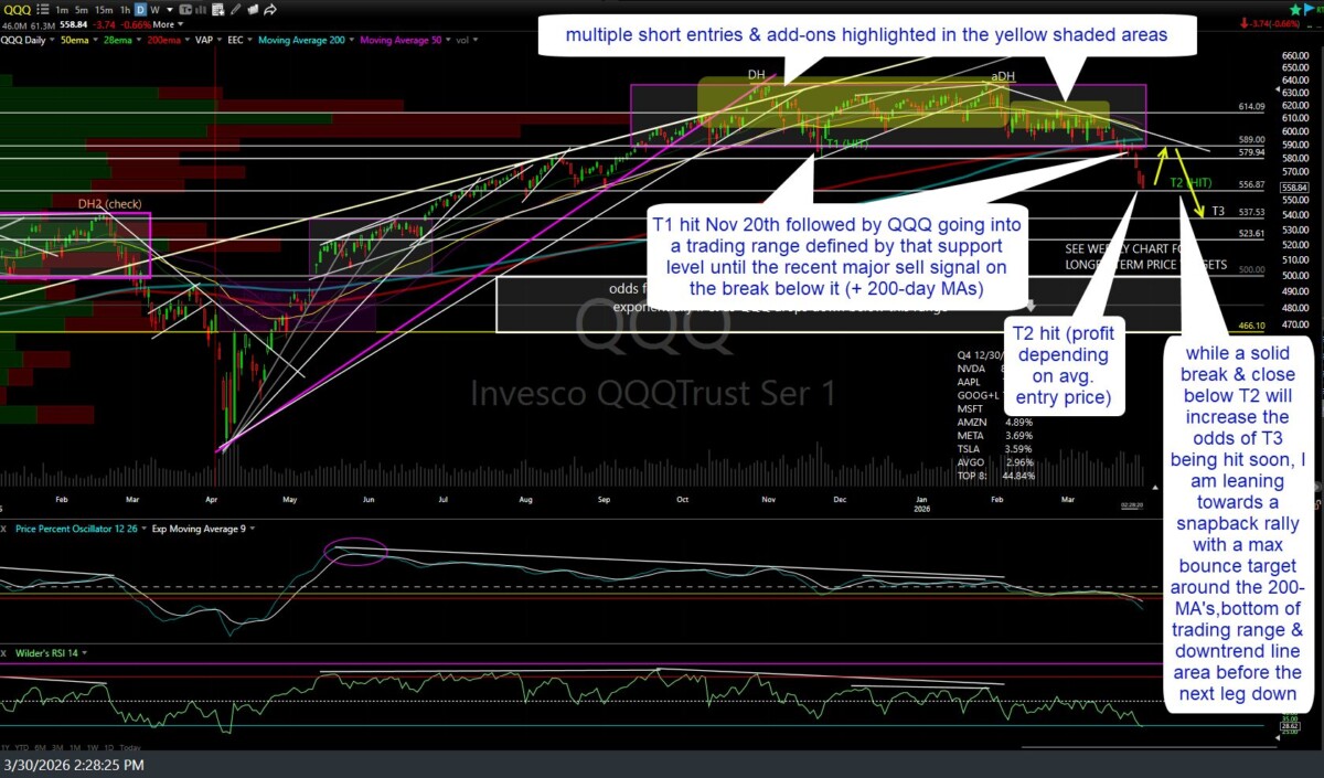 The QQQ (Nasdaq 100 ETF) swing trade has hit the second price target (T2), where the odds for a reaction are elevated before the next leg down. The profit for this trade depends on one’s average entry price, as multiple objective short entries, add-ons, and/or re-entries have been highlighted since the Nasdaq was topping over the past 6+ months.
