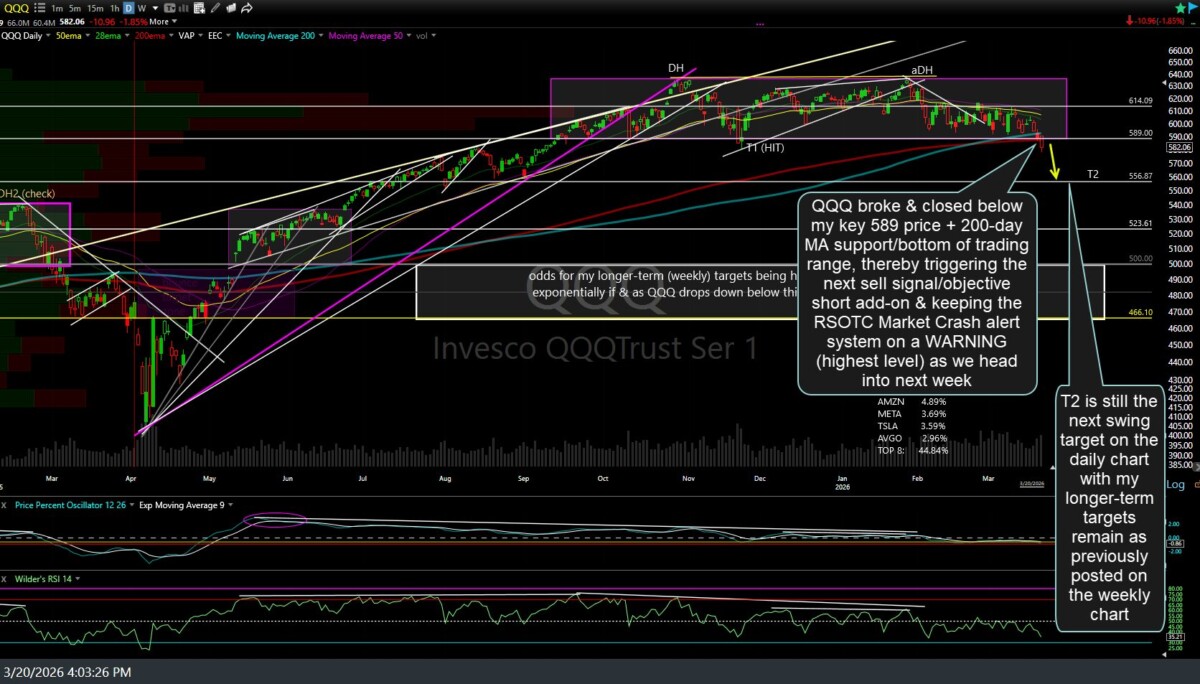 While a solid break & close below T2 (556.90ish support) will increase the odds of T3 being hit soon, I am currently leaning towards a snapback rally with a max bounce target around the roughly intersecting 200-MA’s, bottom of trading range & downtrend line area before the next leg down. However, the RSOTC Stock Market Crash Warning remains in Effect for now, with the odds higher today than when the status was upgraded from a Crash WATCH to WARNING just over a week ago in this post on March 19th.