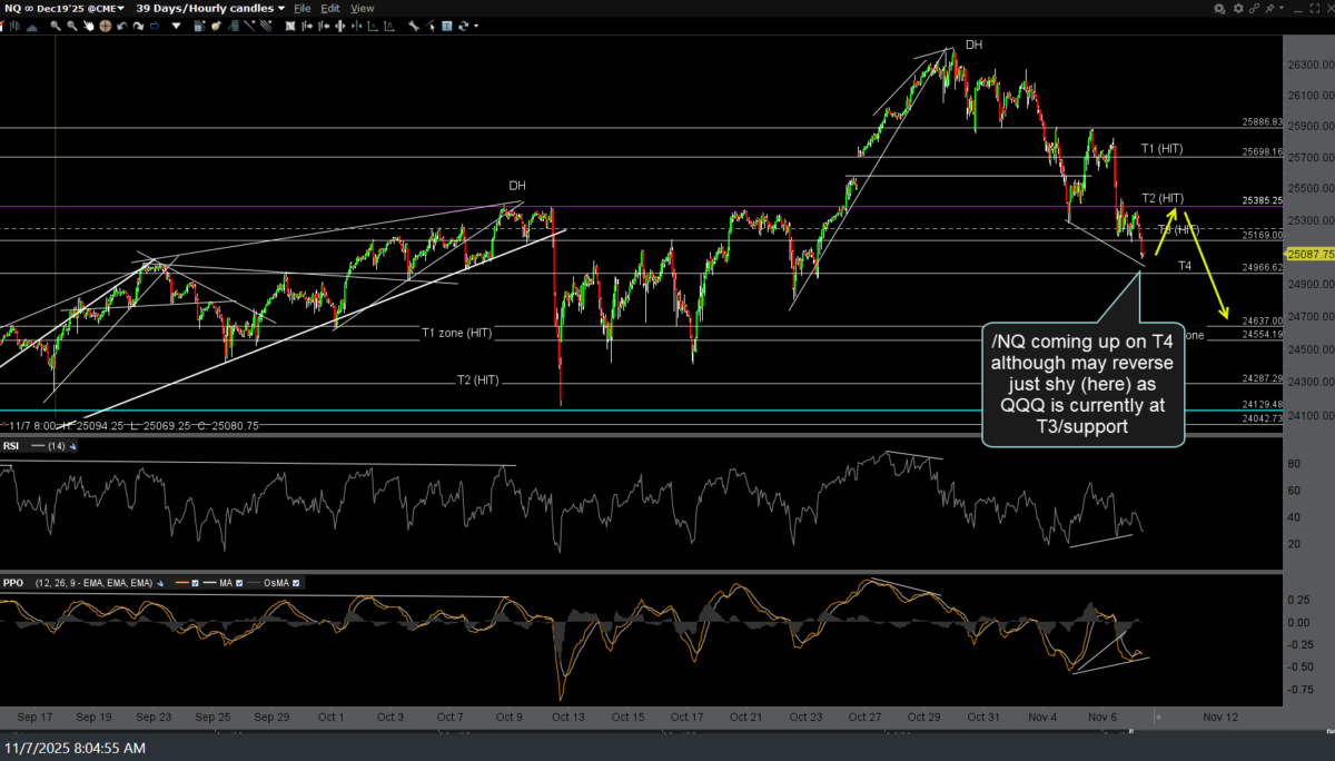 Likewise, /NQ (Nasdaq 100 futures) is coming up on my fourth price target (T4), although it may reverse just shy (here) as QQQ is currently at T3/support. 60-minute chart below.