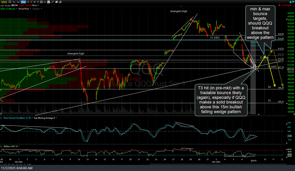 The QQQ (Nasdaq 100 ETF) short swing trade has just hit the third price target (T3) in the pre-market trading session, with a tradable bounce likely (again), especially if QQQ makes a solid breakout above this 15-minute bullish falling wedge pattern. Bounce or no bounce, I still favor the additional downside targets, especially if SOXX makes a solid & sustained breakdown below the primary uptrend line that I highlighted in the recent semiconductor sector video.
