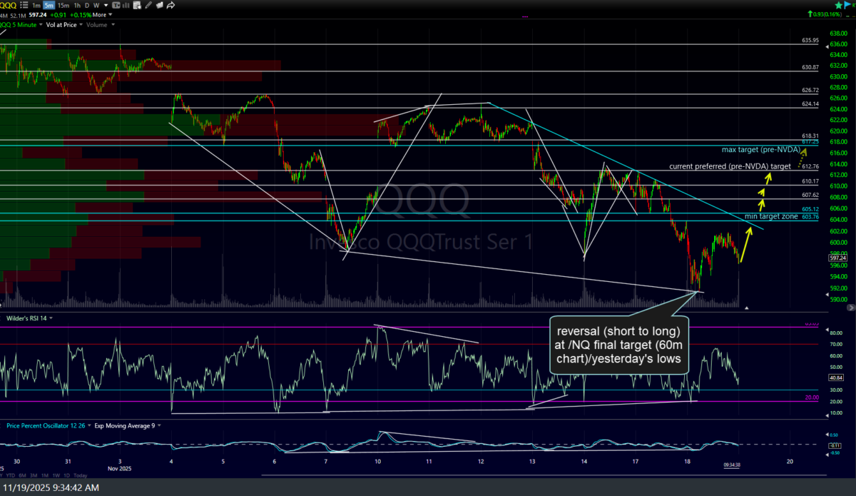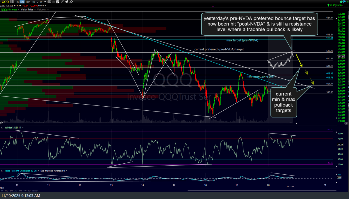 QQQ has just hit the preferred “pre-NVDA” bounce target from yesterday’s 5-minute chart. While the majority of market-leading mega-tech stocks, including NVDA, remain above my key (blue) support levels, along with QQQ having broken out above the recently highlighted 60-minute bullish falling wedge pattern (intermediate-term bullish until & unless the recent lows are taken out), that 612.76 pre-NVDA bounce target is still a resistance level with a tradable pullback likely. (i.e.- an objective level for an active trader to short or reverse from long to short with stops somewhat above). Previous & updated 5-minute charts with pullback targets below.