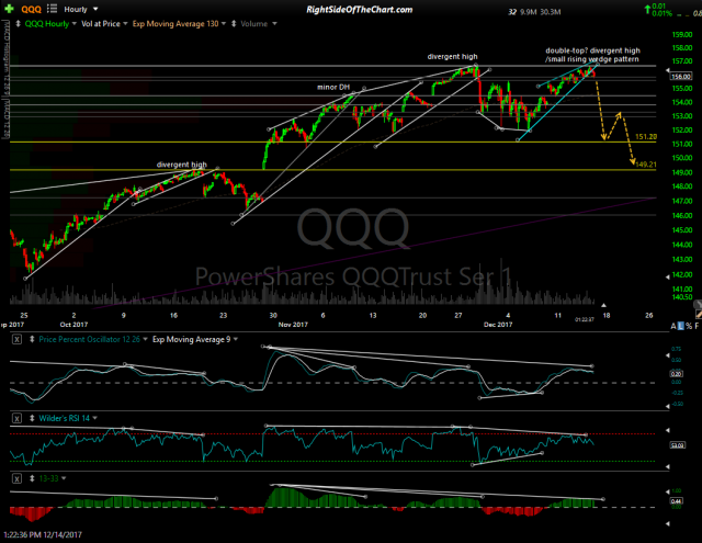 QQQ (Nasdaq 100 Index Tracking ETF) just turned down after testing the recent highs from November 28th. The same divergences that have been in place over the last week or so continue to build & will remain in place on any marginal new high in QQQ. As long as these divergences persist, the odds are good for another leg down in QQQ, similar or larger in scope to the late Nov-early December pullback. Updated 60-minute & 15-minute charts: