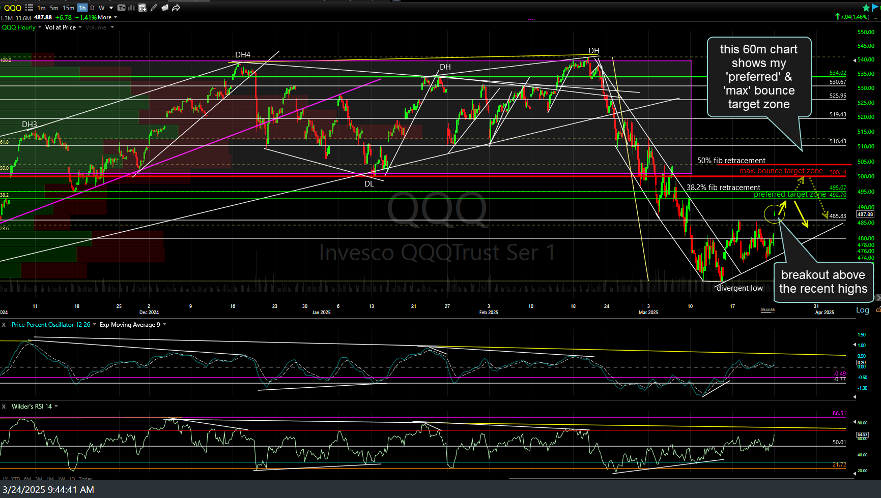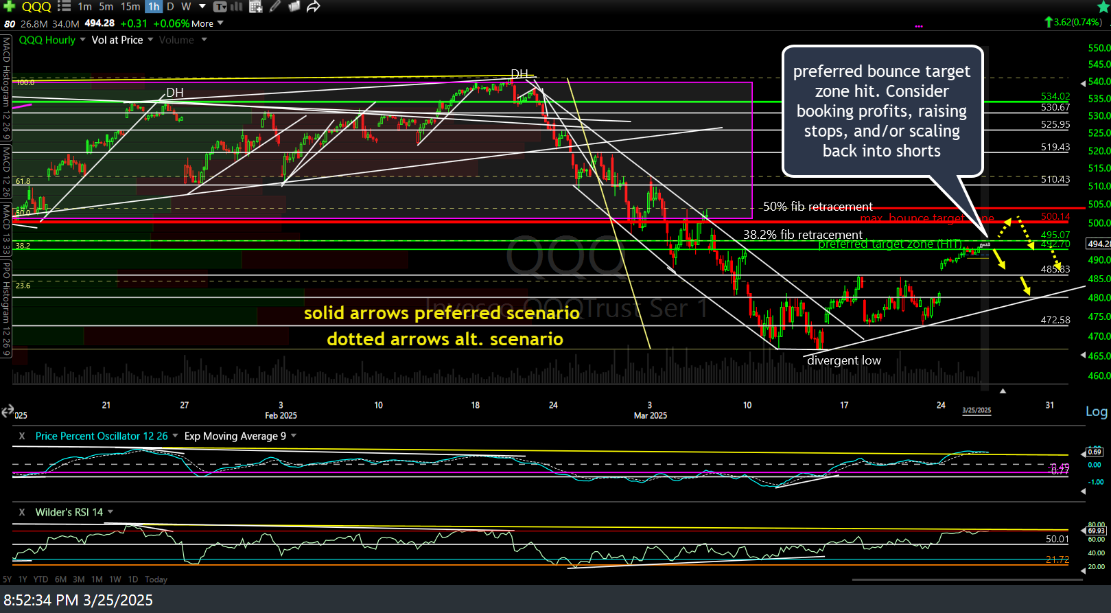 QQQ (Nasdaq 100 ETF) hit the top of my “preferred” bounce target zone, which is both price resistance & the 38.2% Fibonacci retracement of the move down from the recent ATH to the recent lows. Those that reversed recently (covered shorts & went long to game the bounce) might consider booking partial or full profits, raising stops (if holding out for my ‘maximum bounce target zone, or more) and/or begin/continue scaling back into short positions and/or the $VIX indirect hedge (via /VIX, VIXY, or any of the other $VIX proxies). Previous & updated 60-minute charts below.