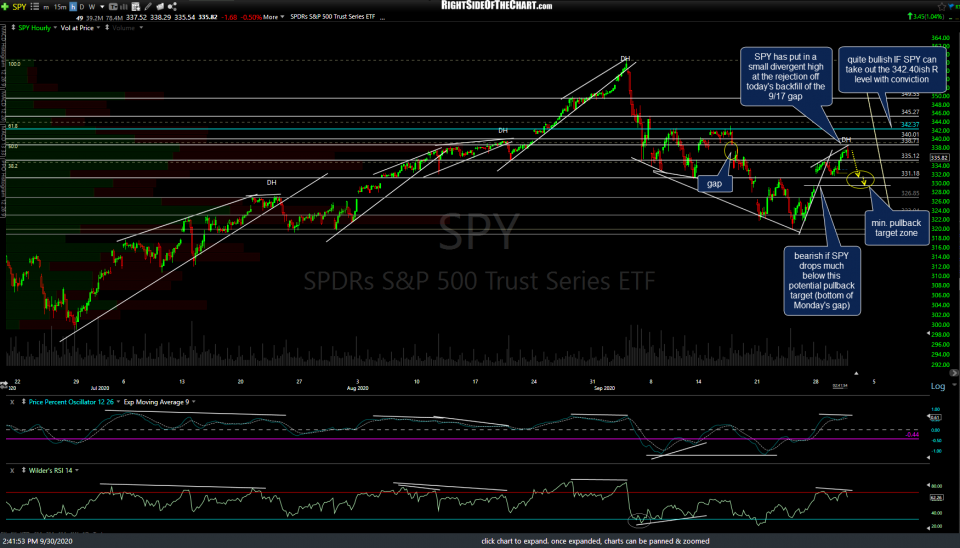 SPY has put in a small divergent high at the rejection off today’s backfill of the 9/17 gap on this 60-minute chart. While QQQ & /NQ are currently testing significant resistance levels, SPY has what I believe to be a comparable resistance level about another 1.15% above today’s high, with that resistance around 342.30. It would be quite bullish IF SPY can take out the 342.40ish resistance level with conviction while bearish of the bottom of my pullback target zone (329.58) is clearly taken out. 60-minute chart below.