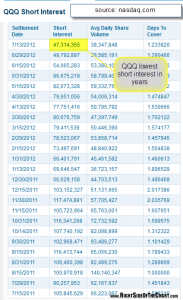 as a follow-up to the recent “…Fear No Evil” post, the nasdaq just released the latest bi-monthly short interest data after the close today & the last data only confirms the lack of fear in the market, regardless of the rhetoric and disinformation spewed about by the mainstream media about how there are too many bears in the market right now. QQQ short interest has reached a new multi-year low as of the latest reporting period (7/13/12) and is less than half of where it was this time last year a mere two weeks before it began a 17%, nearly vertical plunge.