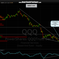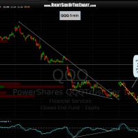 here’s yesterday’s 5 min QQQ chart along with today’s, showing how the primary scenario played out nicely. as the SPY 5 min chart shows, that key index is testing double support here; both a back-test of this descending channel that it recently broke above (undoubtedly, sucking in some longs) as well as horizontal support. a break below that level would likely portend additional downside in the markets while a successful test of that level could set the stage for a small bounce in the broad markets. something worth watching IMO.