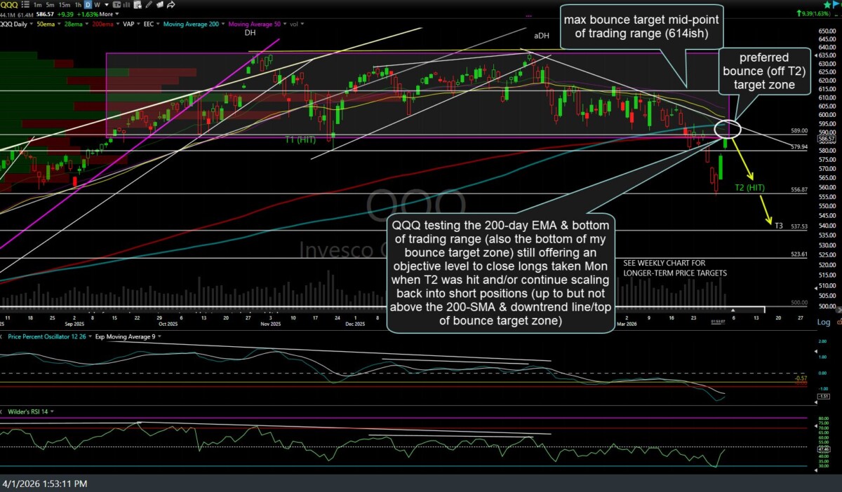 QQQ (Nasdaq 100 ETF) is currently testing the 200-day EMA & bottom of trading range (also the bottom of my bounce target zone) from below, still offering an objective level to close longs taken Mon when T2 was hit and/or continue scaling back into short positions (up to but not above the 200-SMA & downtrend line/top of bounce target zone). Updated daily chart, including my preferred bounce target zones & current max. bounce target, below.