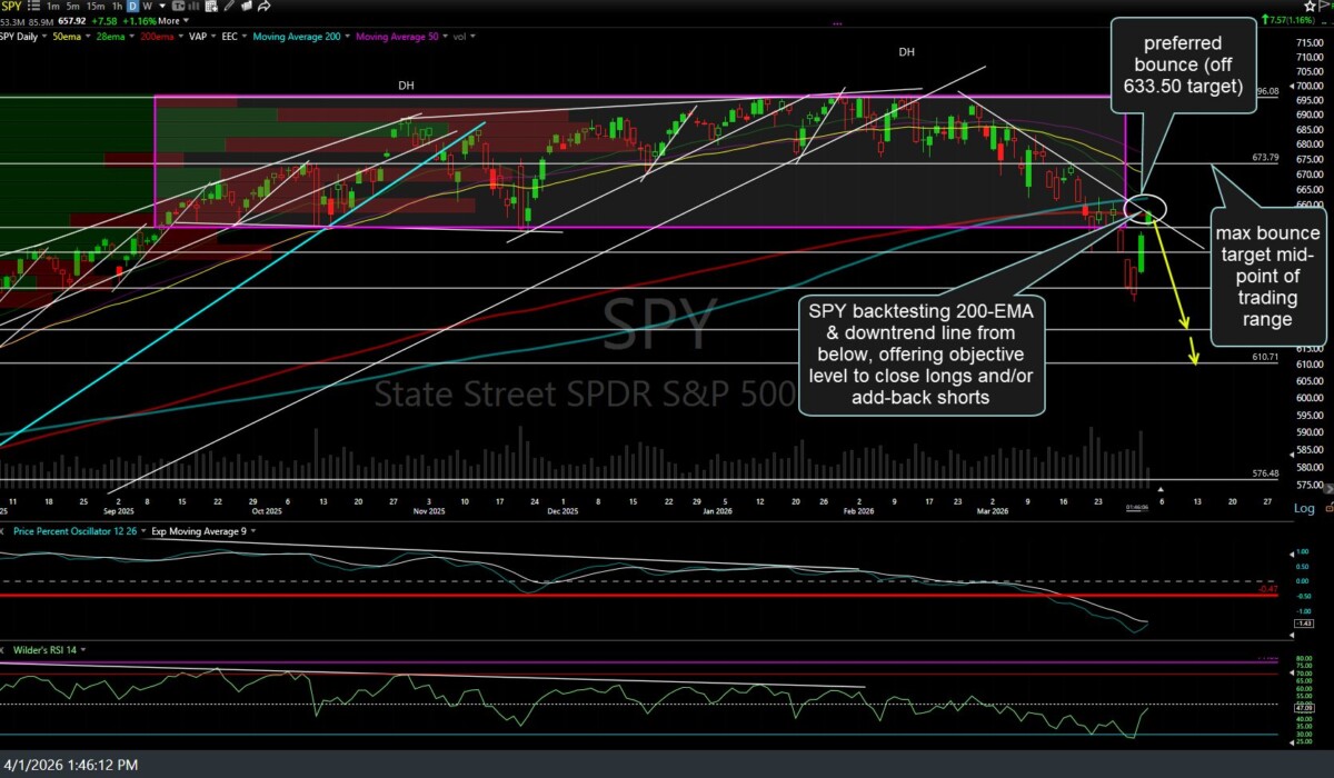 Likewise, SPY (S&P 500 ETF) is also backtesting its 200-EMA & downtrend line from below, thereby offering an objective level to close longs and/or add-back shorts that were covered on Monday when QQQ. SOXX, SPY, & others all hit key price targets/support levels where the odds for a reaction were favorable. Daily chart, including my preferred bounce target zones & current max. bounce target, below.
