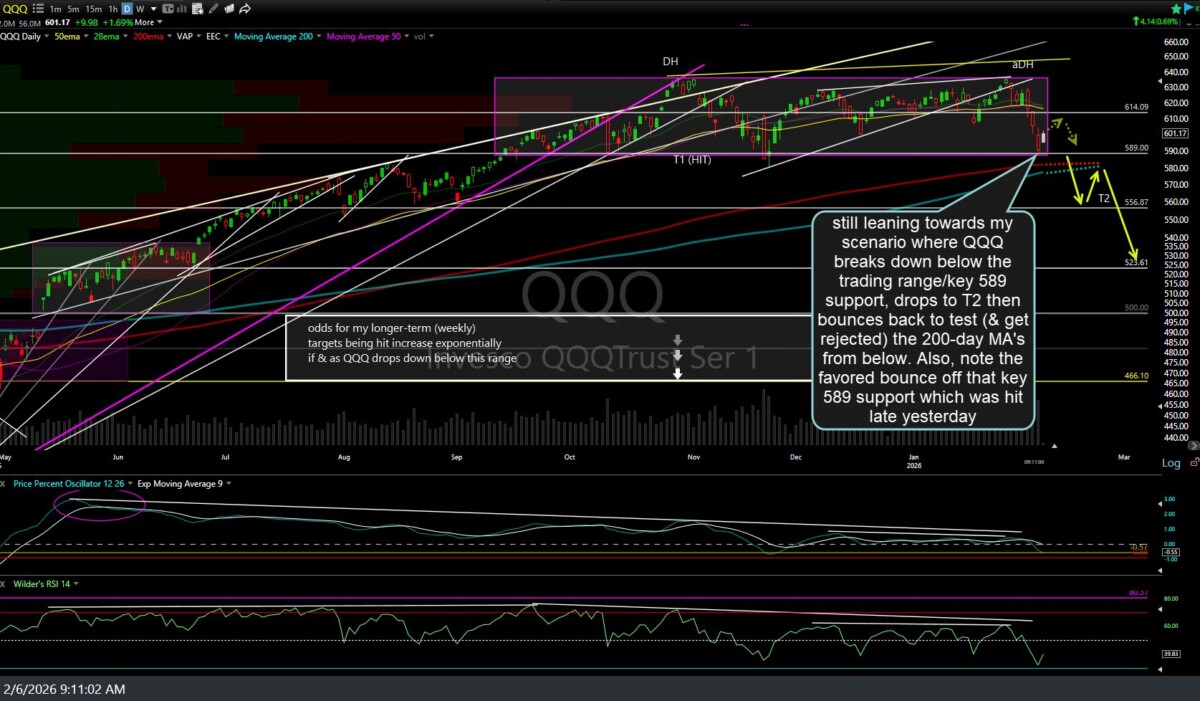 ..and here’s the daily chart of QQQ, showing yesterday’s & today’s after-hours & pre-market trades in the white candles. I’m still leaning towards my scenario where QQQ breaks down below the trading range/key 589 support, drops to T2, then bounces back to test (& get rejected) the 200-day MA’s from below. Also, note the favored bounce off that key 589 support, which was hit late yesterday.
