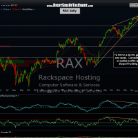 RAX has hit the final target (T3) for a 30.2% gain in less than 3 weeks from entry so congrats to those who “racked” up the gains on this one. As I had T3 listed as the final target and that level was hit and exceeded today (I only count the gains to the target, not beyond unless prices were to gap beyond a price target), I will consider this trade completed and remove it from the active trades category. However, I do feel the stock will likely continue lower to around the 45.50 area in the upcoming weeks so I have added an “unofficial” target for those who might want to let some of their position ride for additional gains or maybe re-short on a bounce from current levels (we are at the top of a fat gap, so a bounce is likely before continued downside). Charts on this trade in order as posted.