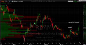 for those in the RIMM trade, here’s a 4 hour chart with an initial short-term target. as mentioned last week, i think this trade has the potential to be a good long-term swing trade/investment assuming that 1) we get some follow-up this week to friday’s breakout and 2) the market holds up. personally, i still believe the R/R does not warrant a full invested (on the long-side only) portfolio at this time but it’s up to every trader on what to take and how much of it to take.