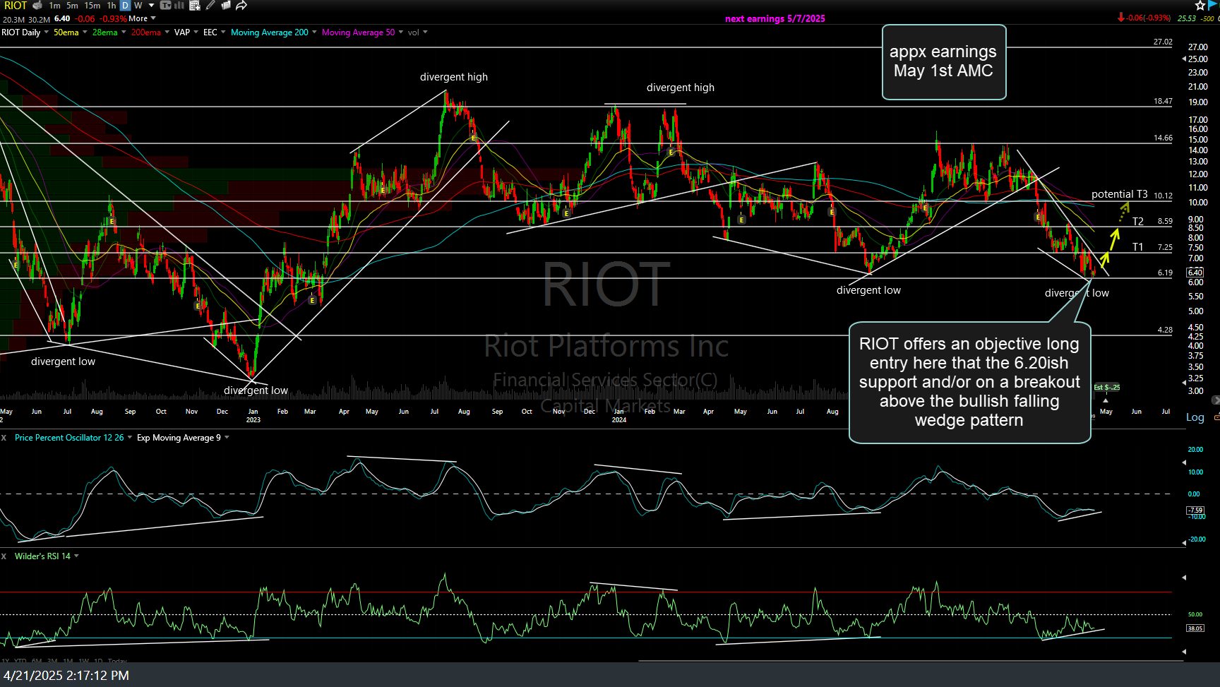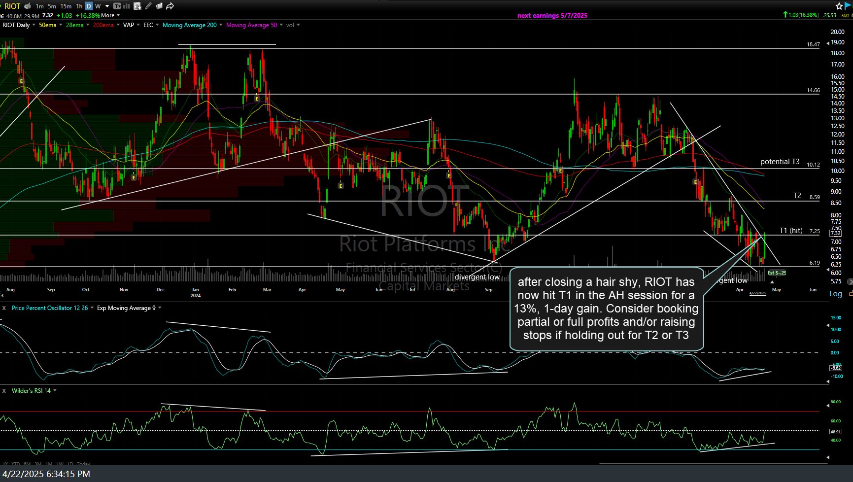After closing a hair shy below it today, the RIOT (Riot Platforms) swing trade has now hit the first price target (T1) in the after-hours session for a 13% gain since the entry yesterday. Consider booking partial or full profits and/or raising stops if holding out for T2 or T3. Previous & updated daily charts below.