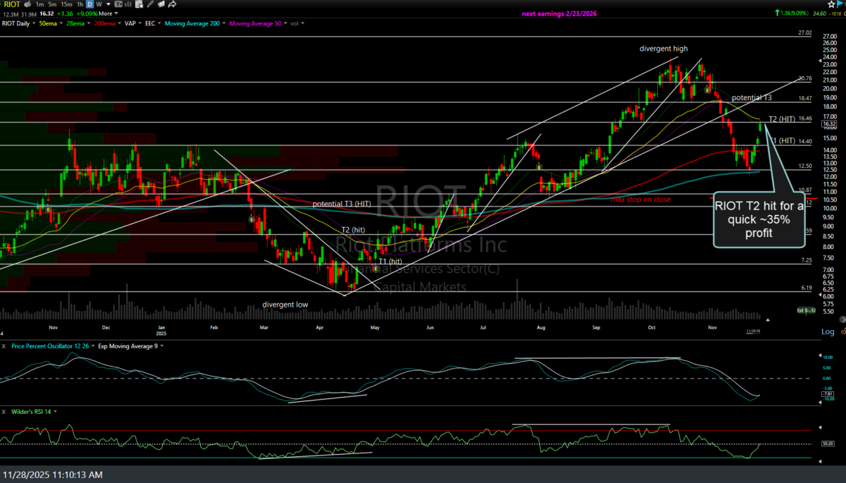 RIOT (Riot Platforms Inc) has hit the second price target (T2) for a quick 35% profit. RIOT was one of several crypto-proxy trades taken at last week’s lows. Depending on your trading plan, consider booking partial or full profits and/or raising stops if holding out for T3. Previous & updated daily charts below.