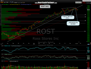 the ROST active short is back to breakeven after a small draw-down caused by the false breakdown a few weeks ago which triggered a short entry. significant negative divergences persist on the oscillators below, likely confirming that the breakdown of this long-term uptrend line (with a wedge top) has quite a bit more downside left before all is said & done. therefore, ROST still offers and objective short entry at current levels. stops TBD.