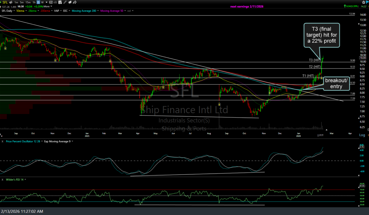 The SFL (Ship Finance Int’l) long swing trade hit the final price target (T3) for a 22% profit & will now be moved to the Completed Trades archives. Initial (Dec 3rd) & updated daily charts below.
