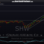 i am adding SHW as both an active trade, as a short from current levels, as well as a set-up for an entry (or add-on) on a break below the channel AND horizontal support (both must go). shorting inside of a powerful uptrend channel like this is for aggressive traders only (complete counter-trend trade plus still within the pattern). however, my own style is aggressive and i often do well by anticipating when patterns that are getting long in the tooth are ready to break down (or up). of course, shorting near the top of this channel with a stop above the recent highs is relatively low risk (minimal downside before your stop) and seems fairly objective from a R/R standpoint, considering the downside potential if this trade starts to play out. lots of thin air once/if the channel breaks down before the final target (T2 is hit).