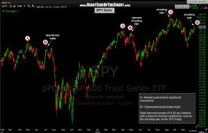 - The SPY put in a shooting star candlestick today (hence, the reason I was on the lookout for a reversal in prices & close near the lows in my previous post today). As this SPY daily chart illustrates, every first counter-trend wave in over the last couple of years (with A being the market peak and B designating the subsequent counter-trend wave making a lower high and peaking just before the real selling kicked in) ended with a shooting star candlestick. Technically, that 5/1/12 candlestick just missed the definition but matched the criteria in spirit with prices moving sharply higher earlier in the day followed by a strong reversal with prices closing near the lows.