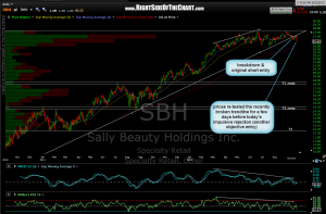 SBH is a good example of an active short trade offering an objective add-on or new short at current levels. although shorting re-tests of a recently broken trendline or support level (assuming that other technical conditions confirm it) is objective in itself, the odds for a successful trade are increased considerable when you have an impulsive reaction off that level, such as SBH is experiencing today. as shown in the previous posts on SBH, this uptrend line dates all the way back to the march 2009 bear market lows, making it a very valid and key trendline. as such, the fact that prices have failed to regain that level after attempting to do so for the last week or so only adds to the probability that the 3 1/2 year uptrend in this stock has ended. although there are never any guarantees that this, or any trade idea posted here will play out, SBH still offers an exceptional R/R even if just the first target is hit, regardless of the fact it is now down over 5.5% on the day.