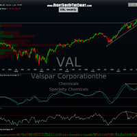 VAL (Valspar Corp) is about to paint the charts red (pun intended) along with competing paint company, SHW (Sherwin Williams). There are a couple of things to note on the daily chart of VAL. To begin with, VAL recently put in an Island Cluster Reversal Pattern, which is a potentially powerful candlestick topping pattern. The formation of this pattern began with the giddy Jan 2nd rally gap up and was completely recently with the large gap down on Feb 12th. Coincidentally or not, that gap down managed to bring prices just below VAL’s primary uptrendline which began with the Aug 2011 lows. Prices have since struggled to regain that trendline as VAL has backtested it from below for the last week or so. Therefore, I’m adding VAL as a active short here at 62.07 with an initial target of 55.55. A logical stop would be on a move above the 64 level, which is just above the lowest point of the island cluster of prices. Daily & weekly charts below. SHW setup to follow.