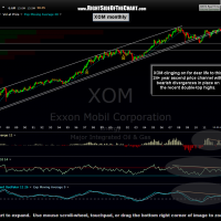 I am adding XOM, which was listed as a short setup about a week ago, as an active trade here at 85.61.  In the previous post, I had pointed out this very prominent bearish rising wedge pattern on the weekly chart and suggested to wait to see a weekly close below the pattern before establishing a short position, as to help avoid the all-to-common false breakdowns that we’ve seen over the last few months.  However, upon further review of the XOM charts as well taking into account the bearish technicals on nearly all US & global indices, I have decided to go ahead and add XOM as a short trade now in order to help assure what will most likely be a favorable entry price should the market sell off sharply between now & the close on Friday.
