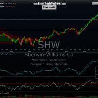 SHW was mentioned in the previous post along with VAL. Both have similar charts, both are in the same industry (paint manufacturers) and as such, will most likely move relatively in tandem. Therefore, make sure to adjust your position size for the overlap if taking both short trade. e.g.- If your normal position size is $10k, you might short $5k of VAL and $5k of SHW.