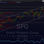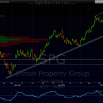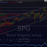 SPG (the overweighted king of the REIT sector) bounced right off that daily uptrend line/bottom of the 60 minute channel that i highlighted earlier (click here to reference those notes). Regardless of the expected bounce off support today, this continues to be one of my favorite trades right now. Here are a couple of the previous charts along with today’s updated charts for both SPG and SRS. on the SRS 60 min updated chart i have added a white horizontal support line in addition to the blue uptrend line that i’ve been tracking. a more conservative trader could use a break below the uptrend line as a stop that should assure a small profit on the trade while a more liberal stop could be placed just below the white line, which is just shy of the original break-out/entry from the SRS 60 min bullish falling wedge.