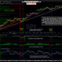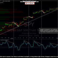 Interestingly, prices closed right on both the shorter-term uptrend line as well as the longer-term uptrend line discussed in the video. Therefore, prices still remain in a confirmed uptrend pending a cluster of the recently discussed 15 minute sell signals (trendline break, 14-34 ema cross, MACD zero line cross and stochastics cross below 80), all of which remain on buy signals for now but are not far from their respective triggers. The second chart below is also a 15 minute SPY chart which simply shows the effectiveness of using divergences on the MACD to warn of impending corrections.