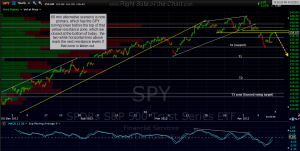 with my primary 60 minute scenario resistance level taken out today, that puts the alternative scenario in play, which should have us turning down soon. if that resistance zone (marked by the yellow horizontal lines) is exceeded, i have added the last two key resistance lines (in white), which if taken out will most likely mean that the market will break out to new highs. i continue to favor scaling short on any additional move to the top of that yellow resistance zone but will likely begin stopping out over that level. if my primary scenario does play out and we turn down soon, depending on the market action i will most likely remove my long hedges and add more shorts. the key here might be how much more powder is left in the central banks’ kegs to continue to buoy the euro and foil the bearish technical patterns (and bullish $USD patterns).
