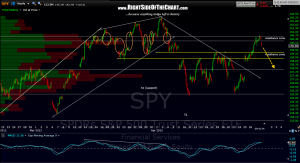 i often harp on the significance of gaps in trading.  last week, i mentioned that my upper resistance zone on the 60 minute SPY chart was comprised of three gaps but that was more of a quick eye-balling reference to how the top of that resistance zone lined up nicely with the top of the 3 very large gaps on that time frame.  this updated chart shows that my resistance zone actually includes 7 different gaps in just the last 6 weeks.  so far prices turned down off the top of that level on friday and today’s gap down brings the number of gaps included in that zone to 8.  if the SPY manages to clearly take this resistance level out then i would say the odds that the market continues to go on to take out the old highs would be pretty good.  until then, the near-term trend remains down and the intermediate-term trend will be clear once the SPY either takes out the 4/2 highs (in which case we’ll the short-term, intermediate-term and long-term trends will all be up) or the 4/10-4/23 lows are taken out, changing the intermediate-term trend to down.