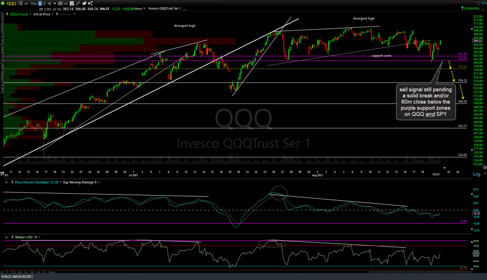 SPY has bounced back to the 441.84 resistance with a reaction here likely with a sell signal still pending a solid break and/or 60m close below the purple support zones on SPY and QQQ. 60-minute charts of SPY & QQQ below.