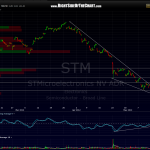 STM was a recently completely long trade that hit T1 before making an abrupt u-turn (great example of why i always recommend taking full or partial profits as target are hit or at least tightening up your stops). anywho, keeping in mind that this is a counter-trend trade (translation: only for nimble or aggressive traders), STM looks poised for a nice pop if it breaks above this bullish falling wedge. i marked a couple of minor resistance levels as well as my first two targets. currently, i only favor T1 and will likely take full profits it it gets there (assuming the trade triggers and i decide to take it). however, trading is dynamic, not static, and as such, i will assess the outlook for this trade based on current market conditions as it plays out, once again assuming that it triggers. for example, if my market bias were to change from bearish to neutral or bullish, then i might favor the 2nd target or even add some additional targets. as for now, i’d be happy with T1 for the approximate 12% gain, especially considering this is a counter-trend trade. here’s the previous daily chart as well as today’s updated daily and 60 min chart.