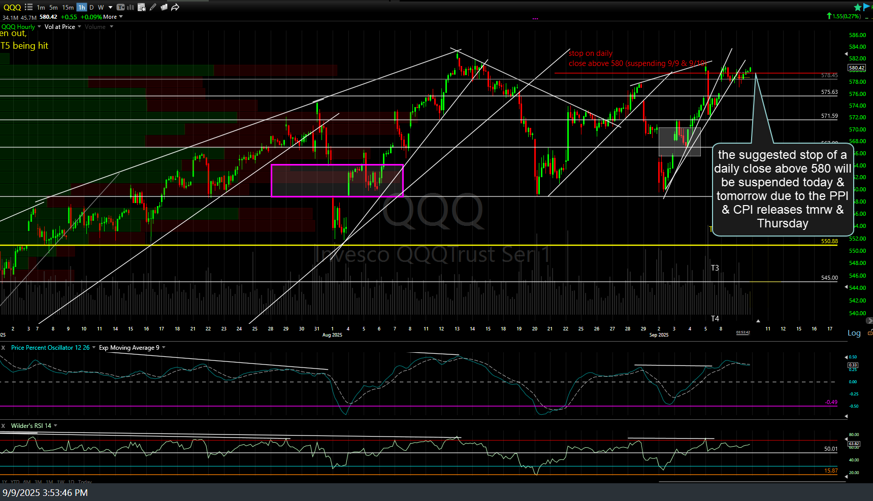 Due to the upcoming PPI (tomorrow) & CPI (Thursday) reports, my preference is to temporarily suspend the suggested stop of a daily close above 580 on QQQ, re-instating it at that same level on Thursday. 60-minute chart below.