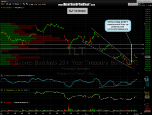 i’m back now & there’s not much to add. TLT hit a minor resistance level on the open today, pulled back and should soon resume moving higher towards the aforementioned target. hard to say tough, whether that will happen in the next few hours or next week as much as i’d prefer to see it happen today. i’ve also added a second target which coincidentally, or not, lines up with the bullish falling wedge technical pattern measurement. i’ll look over the active trades as soon as i get caught up and post any updates, if needed. updated 15 minute chart.