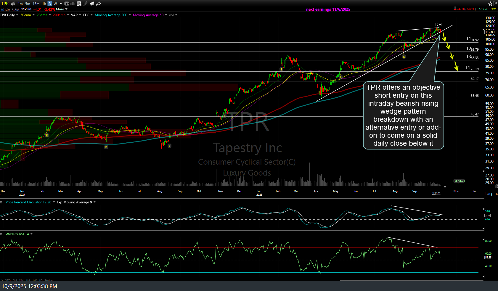 TPR (Tapestry Inc.) offers an objective short entry on this intraday bearish rising wedge pattern breakdown, with an alternative entry or add-on to come on a solid daily close below it. Stops commensurate with one’s average entry price & preferred price target(s). Daily chart below.
