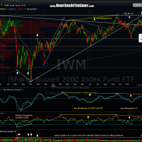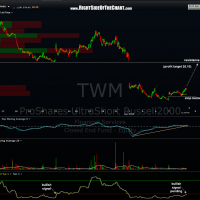 I am adding TWM (2x short Russell 2000 Index etf) as a long here at 23.90 as I am expecting a backfill of the recent large gap in the $RUT/IWM. Due to the expected short duration and good R/R on this trade, I prefer to use the 2x leveraged etf vs. shorting IWM. More aggressive traders could opt for TZA (3x short $RUT) but generally I try to avoid the 3x leveraged etfs unless shorting them due to the price decay. Resistance on the TWM is 25.20 although I will set my sell limit order around 25.10 to avoid missing a fill if the trade works out but reverse just shy of the gap. Stop below 23.60 offers a 4:1 R/R on the trade (0.30 downside vs. $1.20 gain potential). IWM daily and TWM 15 min chart below.