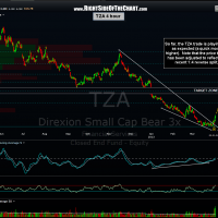 For those in the TZA trade, please note that due to the 1:4 reverse stock split effective yesterday, the new split adjusted profit target is now 49.20 (4x the previous target of 12.30). Here’s the previous 4 hour chart followed by today’s updated chart which reflects the new split adjusted price and target. As my trendlines needed to be redrawn, I have slightly modified the falling wedge pattern to reflect a new, more relevant downtrend line, should prices somehow managed to pullback and backtest the wedge (which I would put at an extremely low probability).
