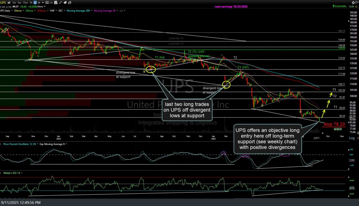 The UPS (United Parcel Service Inc.) swing trade gapped above T1 today, hit the 200-day MA’s, & has settled back on T2 for an 18% profit after briefly spiking above it. Next buy signal to come on a solid break above the 200’s. Previous (Sept 11th) and updated daily charts below.
