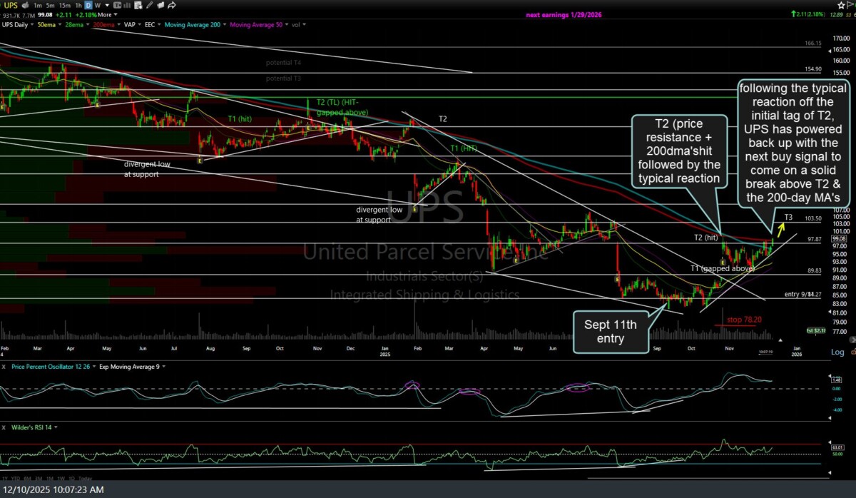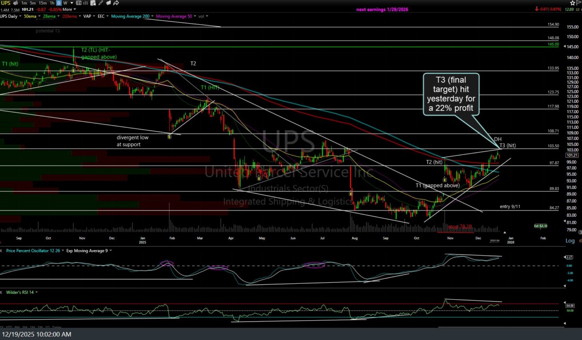 The UPS (United Parcel Services) swing trade hit the third (T3) and final price target* yesterday for a 22% profit, with negative divergences building between price & the momentum oscillators. As this was the final price target, UPS & all previous posts related to this trade will now be moved to the Completed Trades archives. Previous & updated daily charts below.