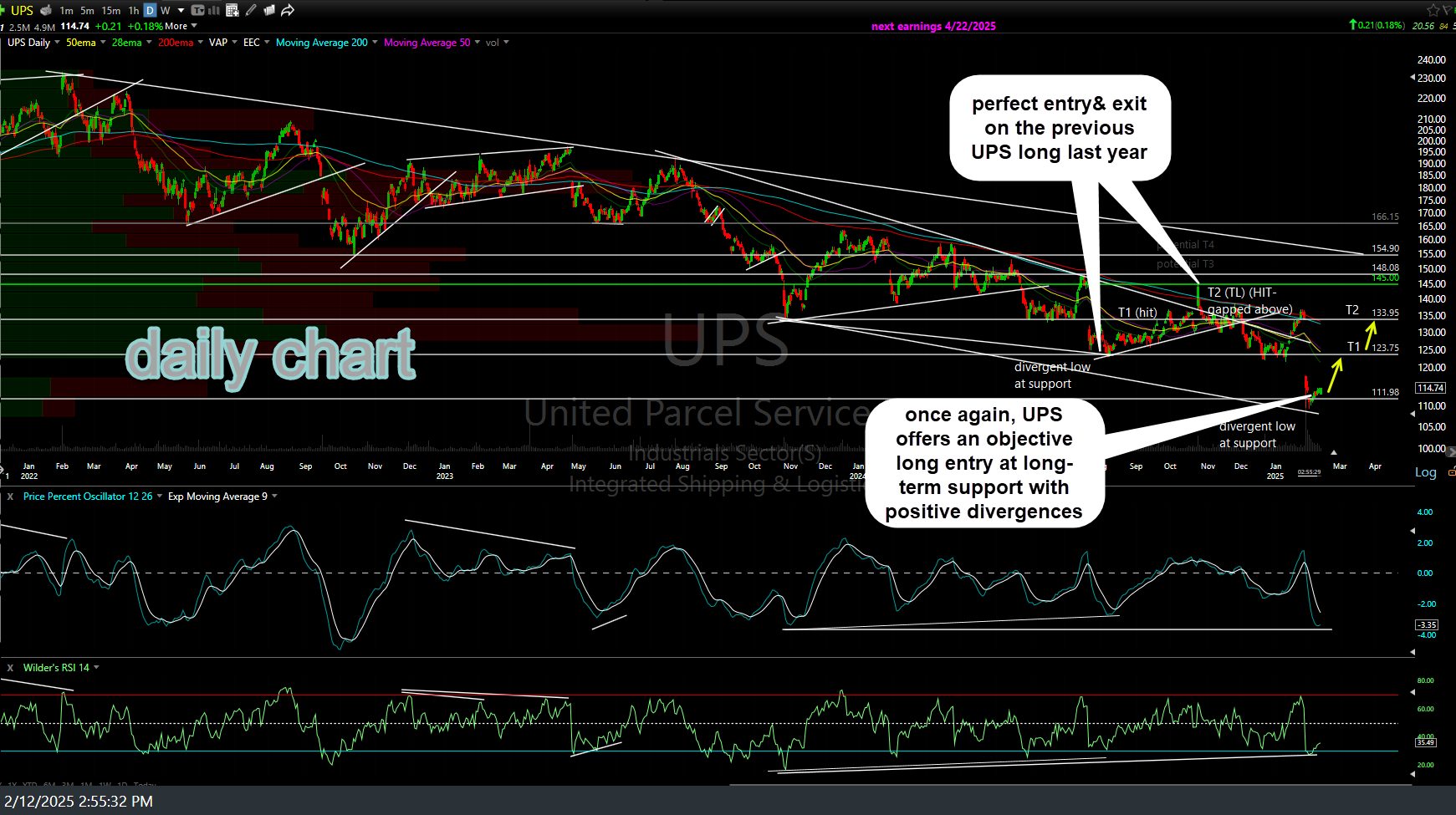 Once again, UPS (United Parcel Service Inc) offers an objective long entry at long-term support with positive divergences just as it did last year with a nearly identical technical posture (at support with positive divergences). That trade had a perfect (at the lows) entry & exit (at the highs) before reversing & putting in this new, larger divergence low.
