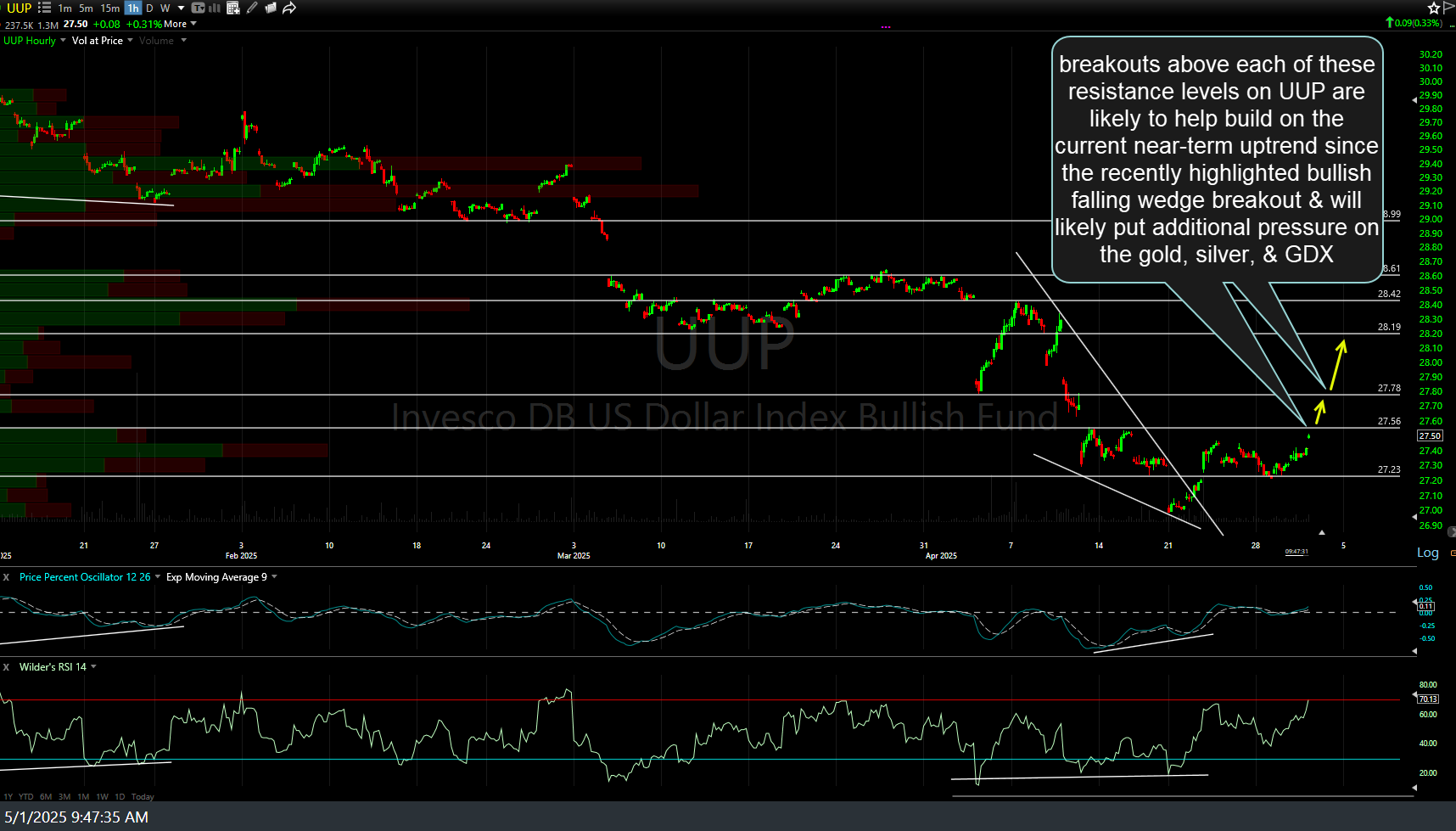 Breakouts above each of these resistance levels on UUP (US Dollar Index ETN) are likely to help build on the current near-term uptrend since the recently highlighted bullish falling wedge breakout & will likely put additional pressure on the gold, silver, & GDX short trades. 60-minute chart below.