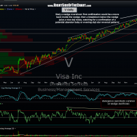 As per the notes on the daily chart of V posted last night (first one below), the price action so far today is setting up for a potential evening star reversal pattern. Of course, we are only about 1/2 way through the trading session so anything can happen before the close today. However, since I am occupied with some non-trading issues today, I just wanted to share this in advance for anyone who might choose to act on the pattern if it looks like we’re going to get confirmation (a close under 158.18…the mid-point of Tuesday’s price range). “Acting on” this bearish reversal candlestick pattern can mean different things to different traders or investors. Someone long in V with embedded profits looking for an objective exit might choose to close their position or tighten up stops while an aggressive trader might look to establish a starter short position before the close today if the pattern looks to be confirmed. I don’t put too much focus on candlestick reversal patterns by themselves but taken in light with the technical case presented last night, I figured that this might be something to monitor.
