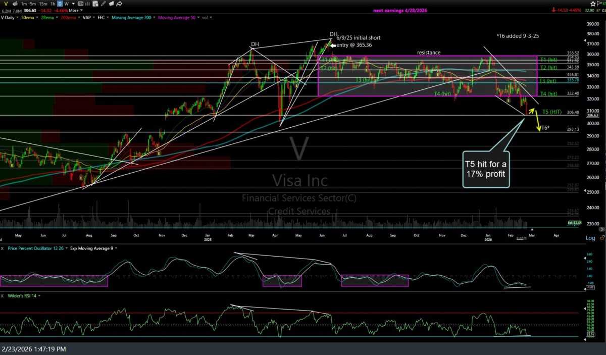 The V (Visa Inc) short swing trade has just hit the fifth price target (T5) for a 17% profit. Depending on your trading plan, consider booking partial or full profits and/or lowering stops if holding out for T6. The two previous & updated daily charts below.